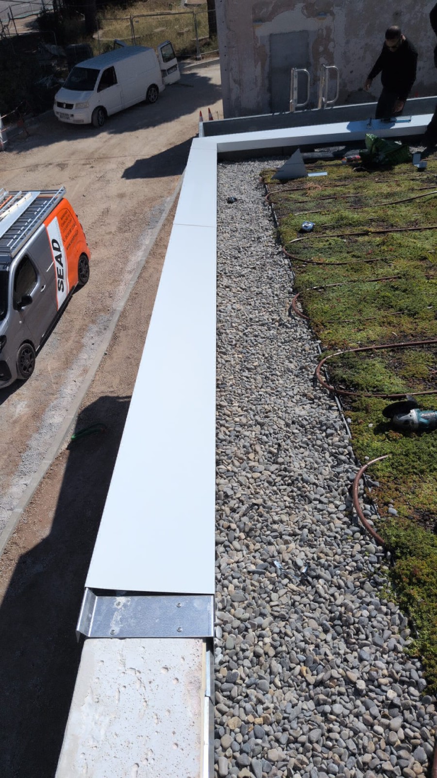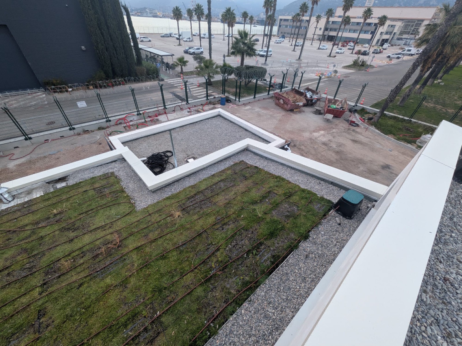 Les zones à 0 % ont reçu une étanchéité bicouche autoadhésive, tandis que les surfaces de 16 à 22 % ont été traitées avec une étanchéité bicouche autoprotégée végétalisée antiracine, idéale pour la durabilité en climat maritime. La pose de bacs précultivés et d’un réseau d’arrosage garantit la pérennité du système.