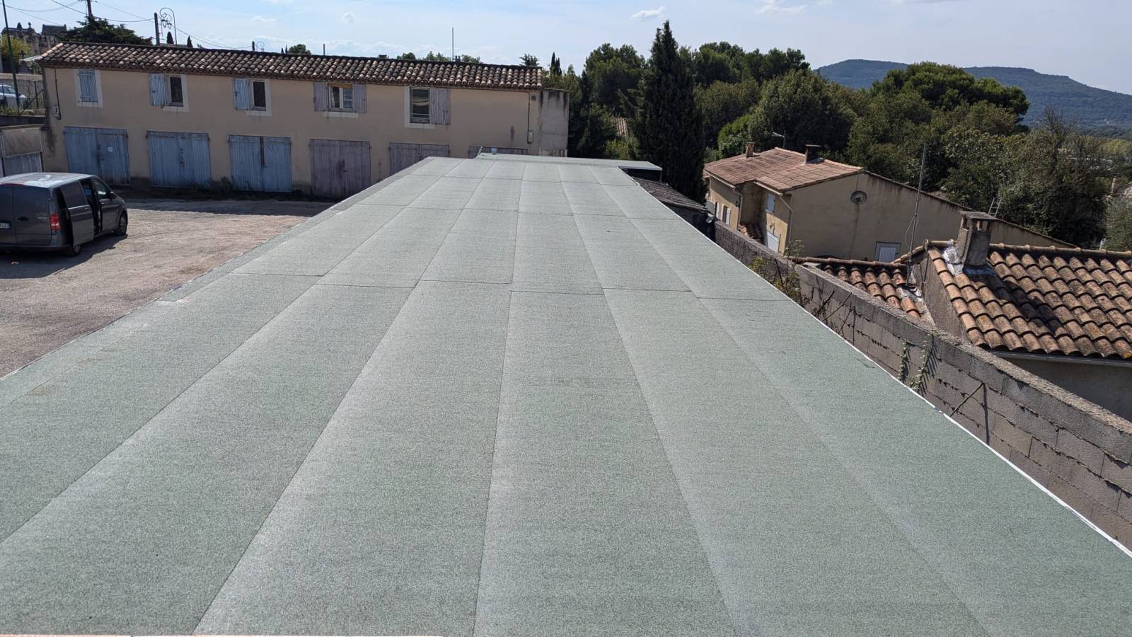 La pose de l’étanchéité sur les garages de Mallemort s’est déroulée en deux phases. La première couche d’étanchéité a été collée en semi-indépendance, permettant à la structure de dilater tout en garantissant une protection efficace. La deuxième couche, quant à elle, a été collée en plein et est composée d’une finition ardoisée. Ce type de bicouche est particulièrement adapté aux conditions climatiques et mécaniques, assurant ainsi une grande résistance aux intempéries pour les bâtiments de Mallemort.