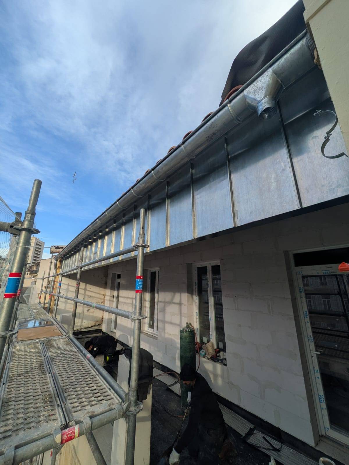 Une attention particulière a été portée aux rives de toiture, avec la reprise des débords et la mise en œuvre d’un habillage de bandeau en zinc façonné sur mesure. Ce type de finition, visible sur la pièce jointe, assure une protection efficace des nez de dalle et des supports bois contre les infiltrations d’eau, tout en apportant une finition soignée et durable.