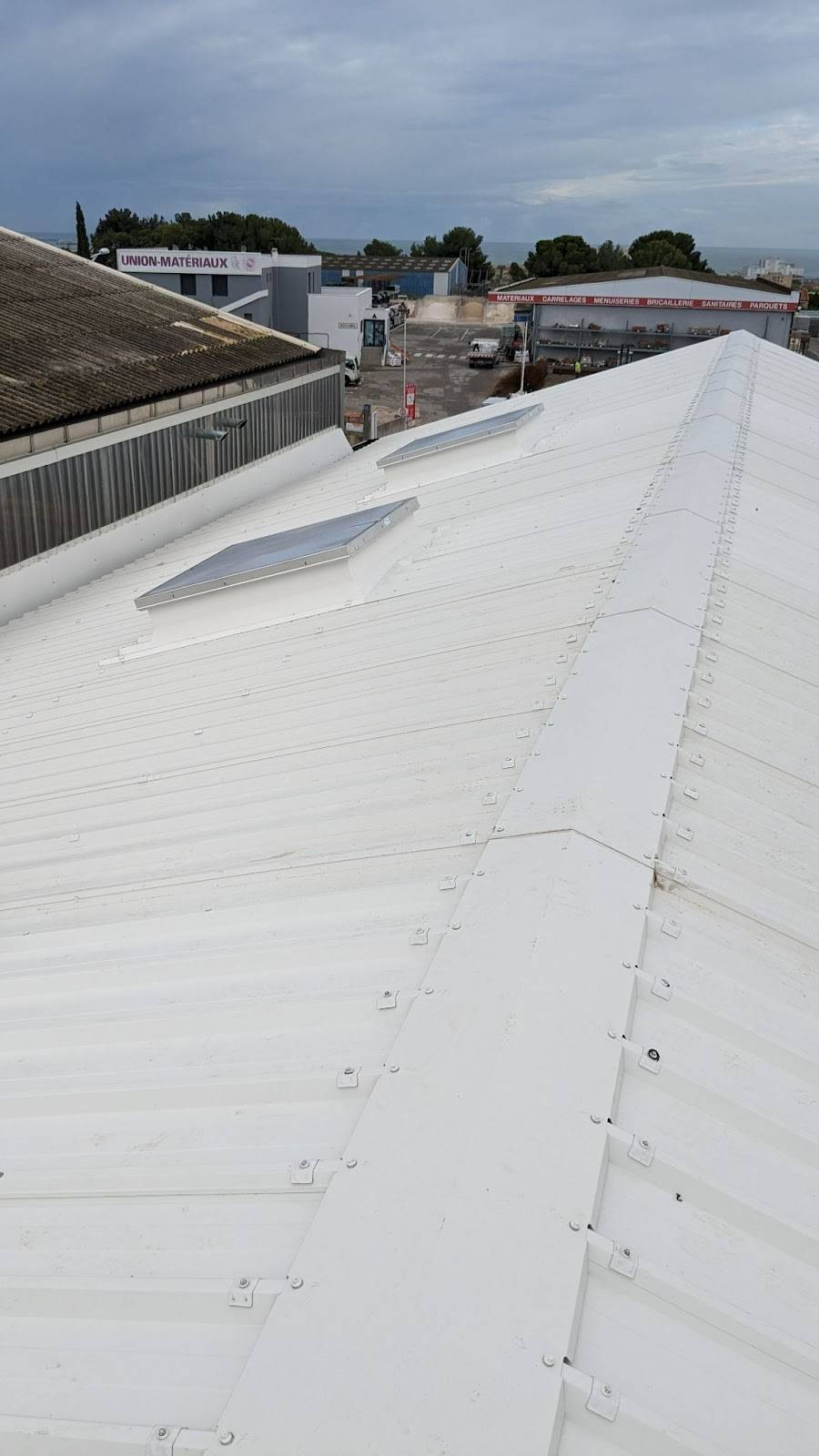 Couverture industrielle en panneaux sandwich 200 mm laine de roche sur atelier à Port-de-Bouc (13). Isolation performante et toiture durable.